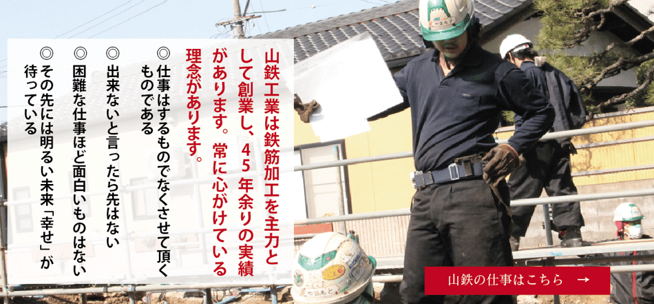 これからは、職人の時代になります。なぜなら建設現場では人手不足が深刻化しているからです。仕事があっても仕事が決まらない時代です。山鉄工業では仕事を通じて自分自身を高めることで、無限大の個々の成長を目指しそれが企業の成長になることに主眼をおき、人材育成を重点とし掲げています。山鉄で学んだ技術はこれから生きる上で大きな武器となり、職に困らない安定した人生を歩めると考えます。