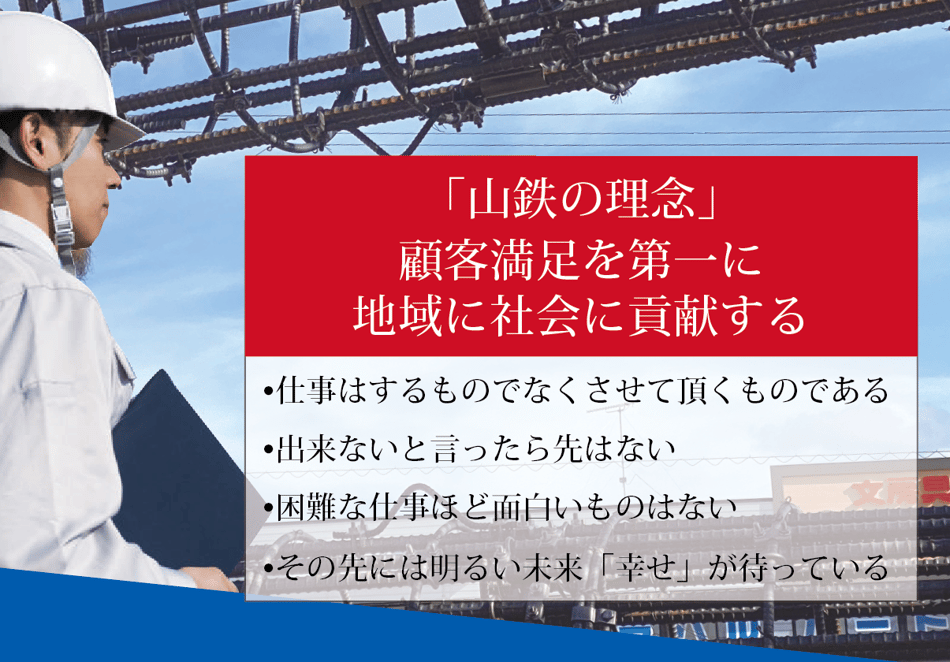 山鉄で働く全員が一丸となり、よりよい『鋼構造物』を完成させるために毎日が真剣勝負で仕事にあたっています。また、先輩から後輩のサポートも重視し、技術はスムージに伝承し、その結果総合力が上がり、会社がよくなり幸せに繋がると信じ合っている仲間です。